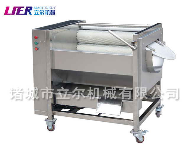 當(dāng)原料放入該機后,毛刷輥旋轉(zhuǎn)刷洗原料并使其不斷翻轉(zhuǎn),同時,排水管不斷地噴淋,把從原料上刷洗下來的污物沖洗掉,直到洗凈為止,順著毛輥的旋轉(zhuǎn)方向出料。